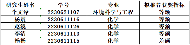 根据《安徽工程大学研究生国家奖学金评选办法(修订)》(校研字〔2023〕13号)和《关于开展2025年研究生国家奖学金、学业奖学金评审工作的通知》等文件精神和规定,学院组织开展了研究生国家奖学金的评选推荐工作。在学生申请的基础上,化学与环境工程学院2025年度研究生奖助学金评审委员会对照条件,按程序组织了评选推荐工作。学院拟向学校推荐2025年研究生国家奖学金名单如下,公示期间如有异议请及时向学院反映。