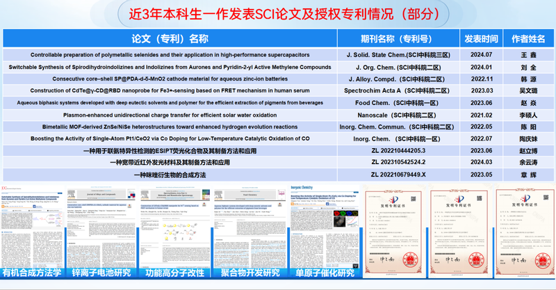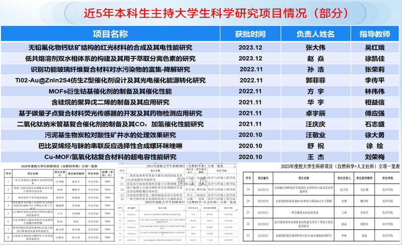 近五年来,我院学生在多项学科竞赛中表现优异,累计在全国大学生实验竞赛、全国大学生节能减排竞赛、全国大学生化工设计竞赛、中国大学生Chem-E-Car竞赛、“挑战杯”安徽省大学生课外学术科技作品竞赛、安徽省“互联网+”大学生创新创业大赛等国家级和省级赛事中获奖240项。获批国家级和省级大学生创新创业训练计划项目100余项。为持续扩大赛事影响力,学院积极开展成果孵化与展示,通过组织赛事经验分享、加强宣传报道等方式,提升学科竞赛、社会实践等活动的关注度与参与度。让“以赛促学”的理念如种子般在学院沃土中生根发芽、开花结果,逐步构建起积极向上的创新文化与氛围,有效激发学生投身实验室和科研团队的热情。在此推动下,近五年来,本科生参与发表学术论文50余篇,获授权发明专利近20项,充分展现出学生科研创新能力与综合素养的全面提升。