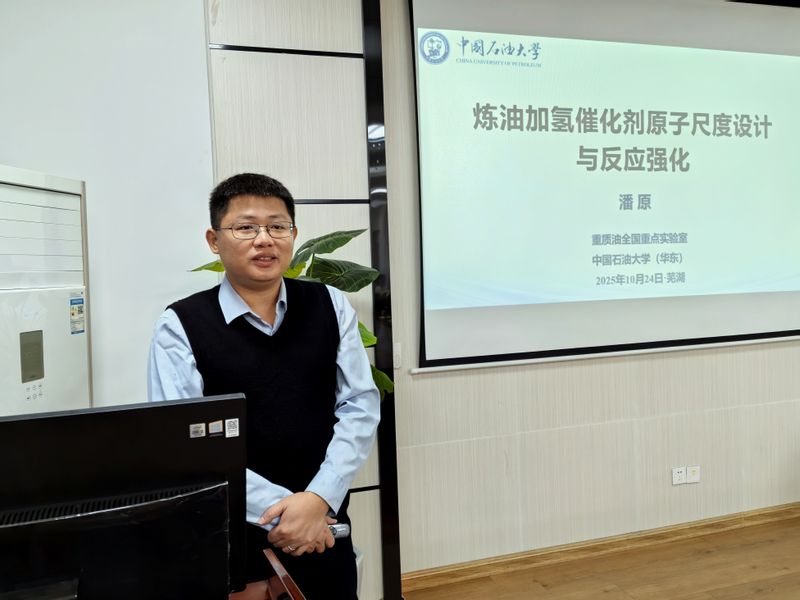 交流会上,潘原教授作了题为《炼油加氢催化剂原子尺度设计与反应强化》的学术报告。报告系统阐述了当前劣质重油高效转化与烯烃高值化利用领域的研究现状与关键技术挑战,重点分享了其团队在重油浆态床加氢裂化单原子催化剂设计方面的创新成果。潘教授详细介绍了“超分子自组装-限域硫化”等前沿策略,阐释了如何通过精准调控加氢活性位的原子局域微环境,实现重油加氢转化效率的显著提升。面对当前催化剂活性和稳定性方面的核心难题,潘教授进一步展望了该领域未来技术发展的路径与方向,提出了具有前瞻性的研究思路。