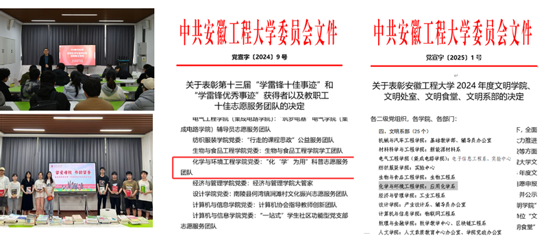 (3)人才培养方面:学生获得省部级及以上竞赛奖励50余项,其中国家级一等奖1项、省部级一等奖5项。获批省级及以上大学生创新创业训练计划项目30余项。本科生参与发表学术论文及发明专利18人次,其中本科生以第一作者身份发表SCI论文3人次。支部以大学生化学实验竞赛为平台,打造学校“一院一品”重点建设项目,在2024年第十三届全国大学生化学实验竞赛中斩获全国一等奖,系安徽省省属高校唯一。并且通过与学生党支部共建、开展考研辅导等活动为毕业生搭建就业渠道,2025年应用化学专业多名本科生考入“双一流”重点院校,学生就业率、考研率稳步提升。此外,应用化学系教师指导的多名2025届硕士毕业生被国内知名院校录取为博士研究生,为博士点申报工作助力。
