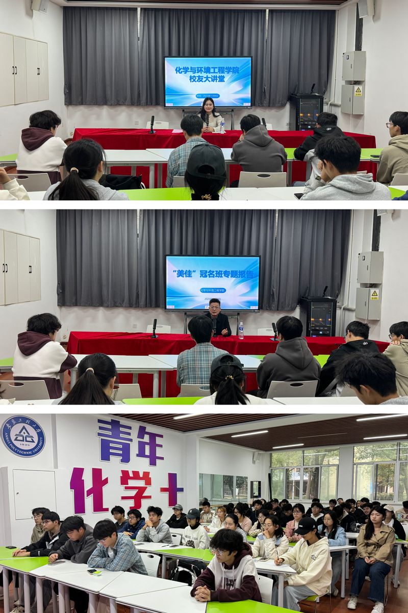 为搭建校企合作桥梁,传承优良学风,11月9日上午,化学与环境工程学院在学院学生能力发展中心举办了校友大讲堂暨“美佳”冠名班专题报告活动。本次活动特别邀请了化工04级校友、上海隆盛化工有限公司总经理雷丽宁,化工04级校友、广东开程装备科技有限公司董事长陈军为同学们做经验分享和专题报告。化学与环境工程学院党委副书记胡承功、副院长李兴扬出席活动。化工专业教师代表、2025级辅导员及2025级化工全体新生参加活动。活动由胡承功主持。