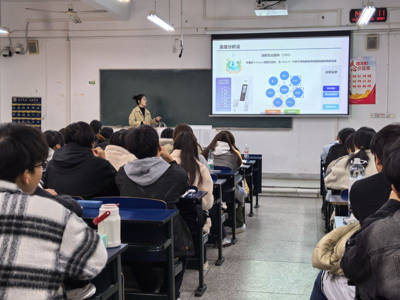 本次示范课面向食品科学与工程专业2025级学生,教学内容聚焦于“沉淀滴定法”与“重量分析法”。课程伊始,徐老师以提问方式引导学生回顾上节课重点,学生反应积极,应答流畅,课堂互动良好。在新课导入环节,她巧妙结合日常生活中对水质的要求,自然引出本节课的教学内容,既增强了知识的实用性,也提升了学生的学习兴趣。