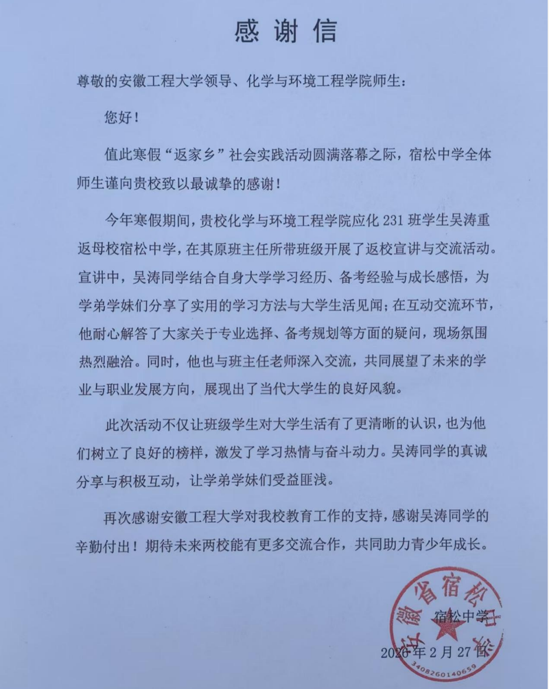 近日,化学与环境工程学院获安徽省宿松中学感谢信,对学院学生应化231班吴涛在寒假期间重返母校开展“返家乡”社会实践暨返校宣讲活动给予高度评价。