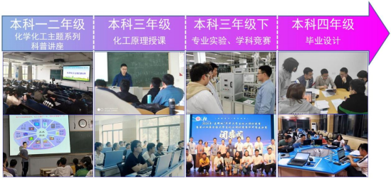 《化工原理》是化学、化工及相近专业的核心专业基础课,对培养学生的基础化学工程思维和能力非常重要。我院在该课程的课程思政建设过程中,一方面通过积极支持教师参加各类教研会议、积极组织校内教研活动等多种途径提升教学团队课程思政教学能力。另一方面,围绕课程思政目标,在课程内容中挖掘出了36个课程思政元素,建立了课程思政案例库,并创新了4种课程思政教学方法,解决了理工科专业课程思政易出现“两张皮”现象的难题。更重要的是,课程团队还将课程思政做了前后延伸,建立了覆盖整个本科阶段的全过程育人模式(图1)。